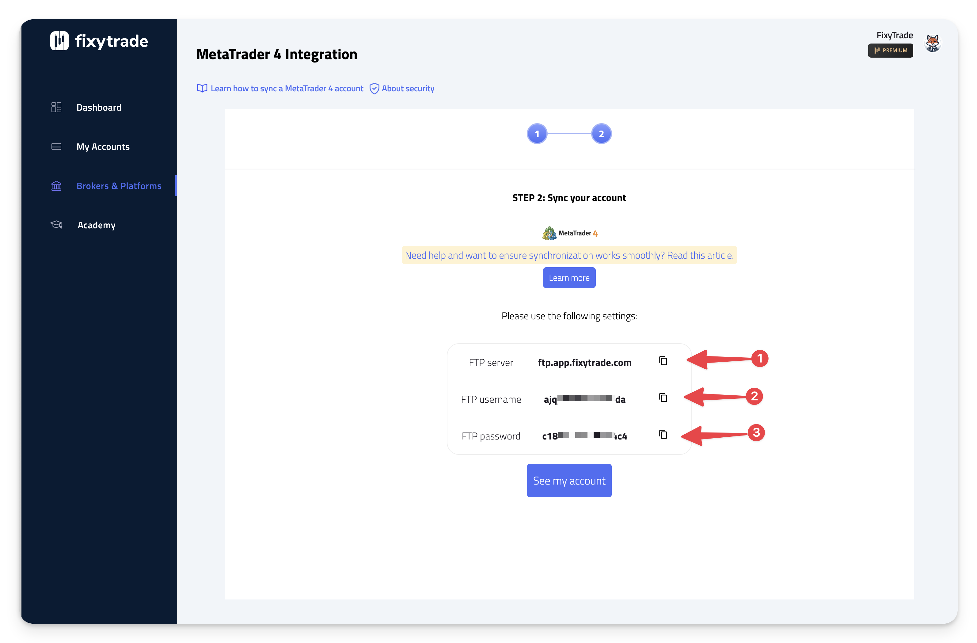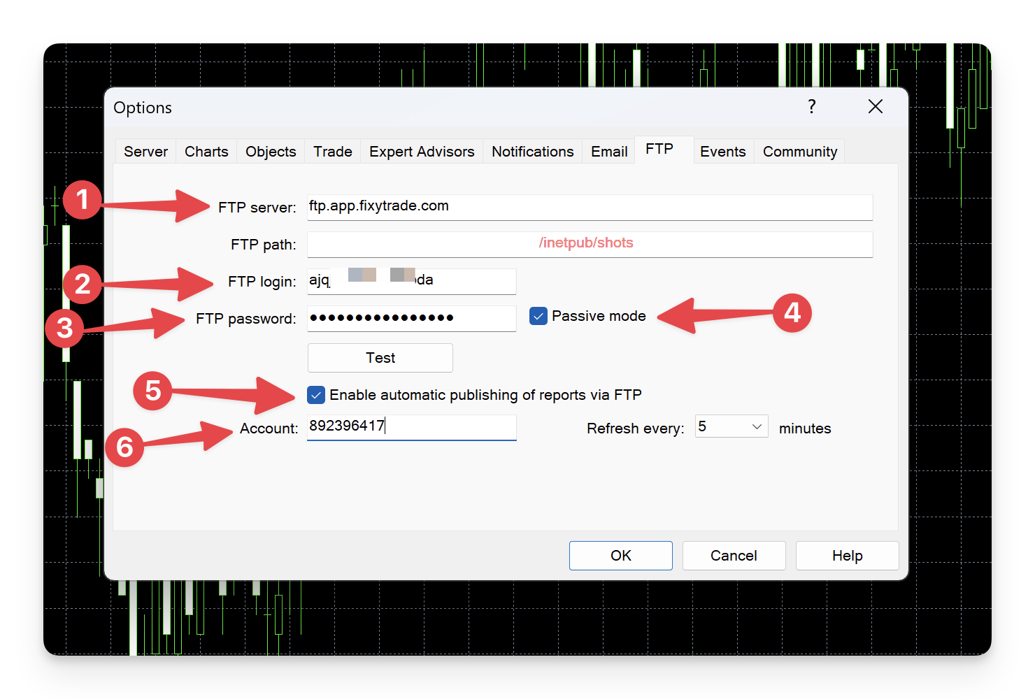Step 5: Then, copy-paste the FTP server url, FTP username and FTP password from FixyTrade to Metatrader 4.