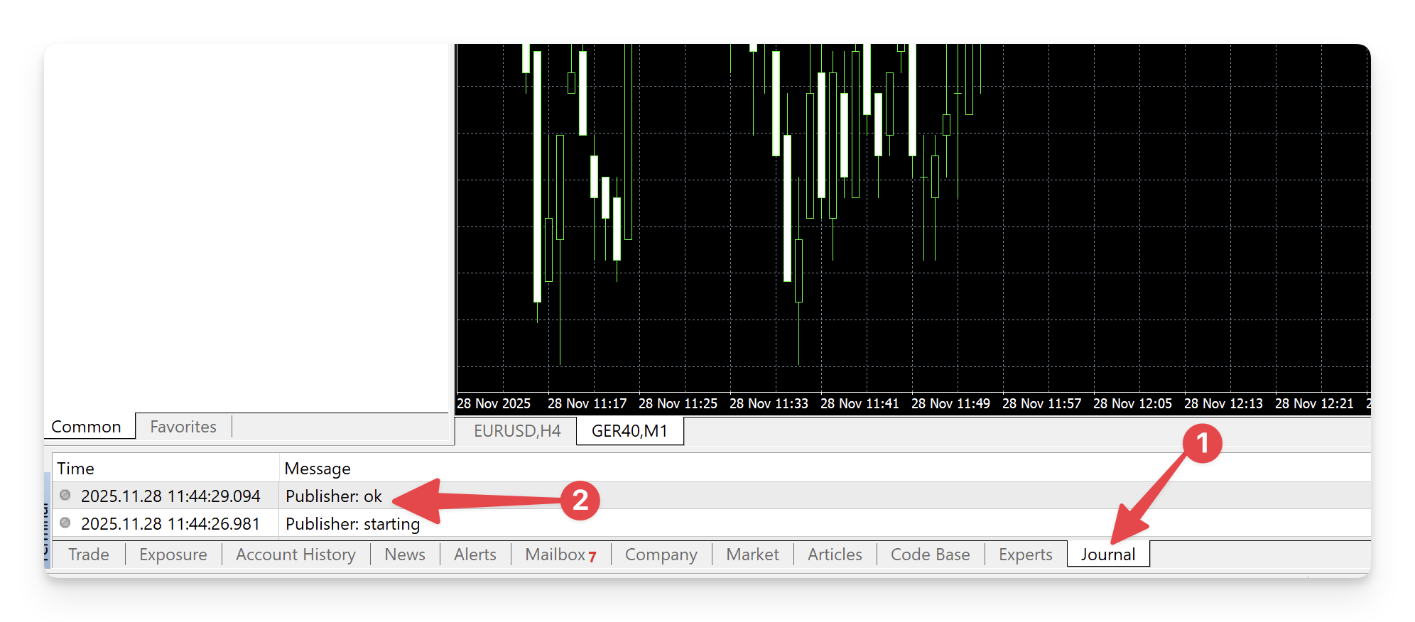 - Step 2: Verify synchronization at any time by clicking on the "Journal" tab within MetaTrader 4. Then wait for the "Publisher: ok" message to appear to confirm that the synchronization was successful.
