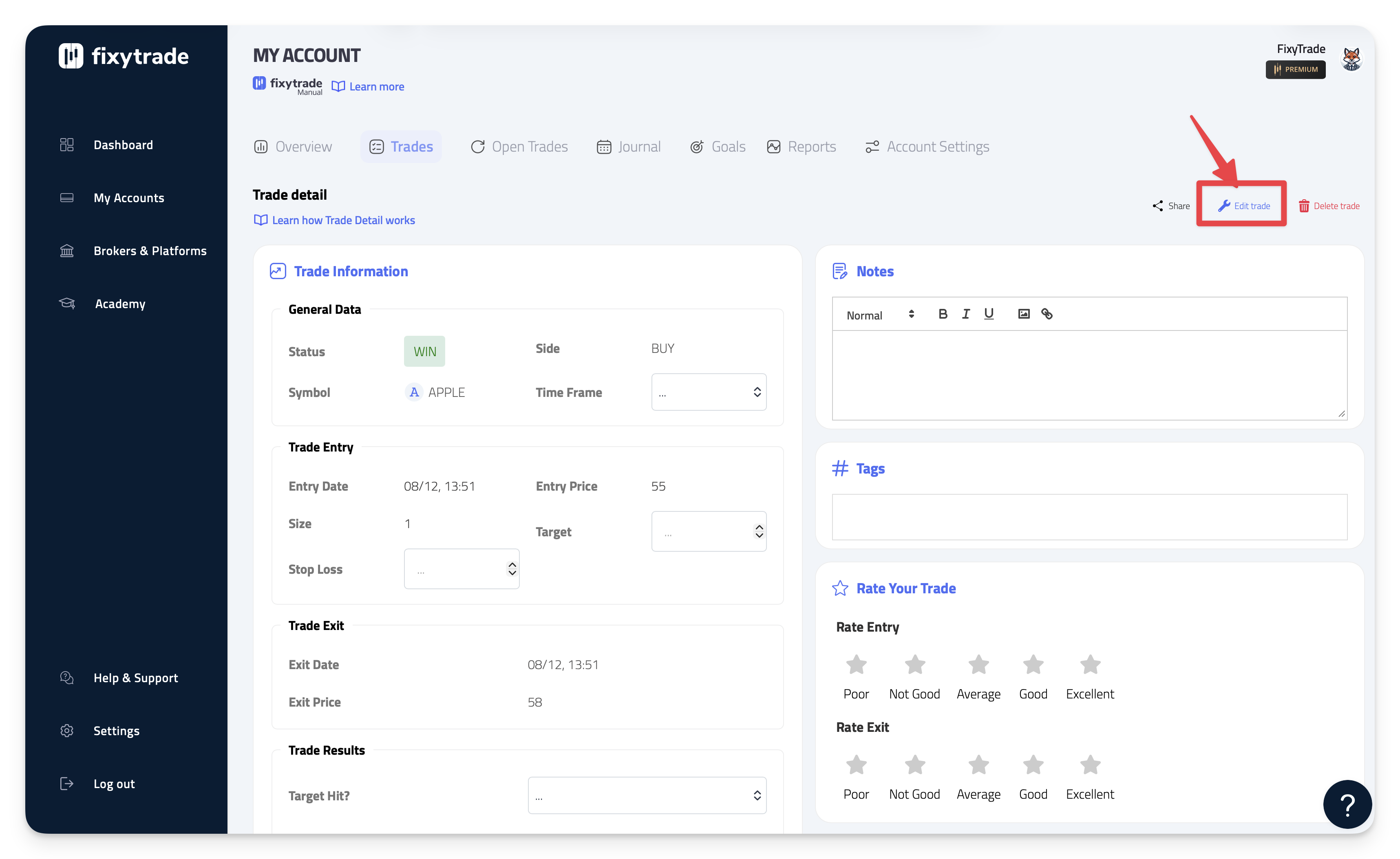 Furthermore, if you click on a particular trade, you will be taken to the trade details. You will be able to modify the trade, close it or add notes, images, tags, and more. Learn more.