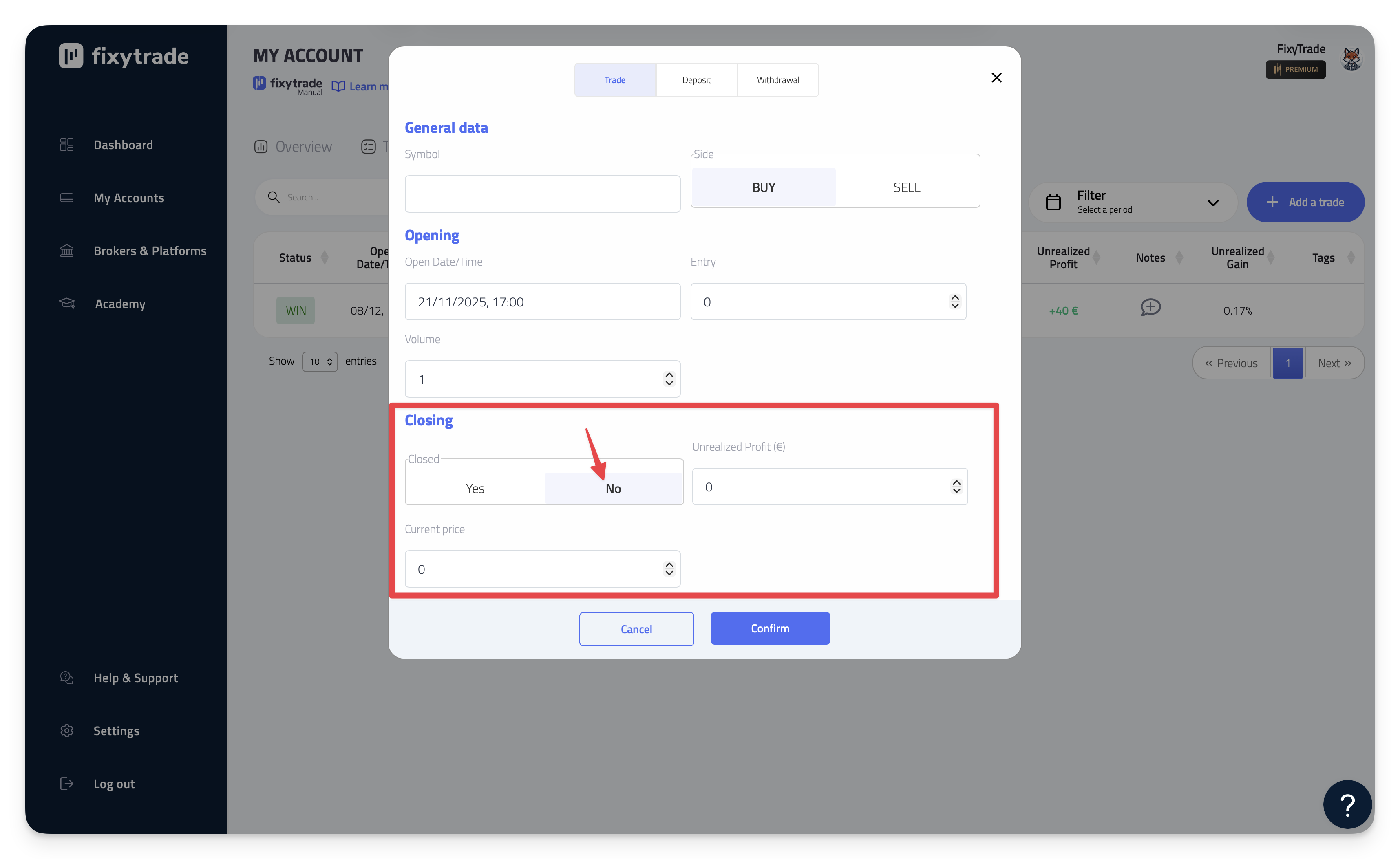 When your trade will be closed on your trading platform, you will have to transform it into a closed trade in FixyTrade. To do this, follow the steps below: