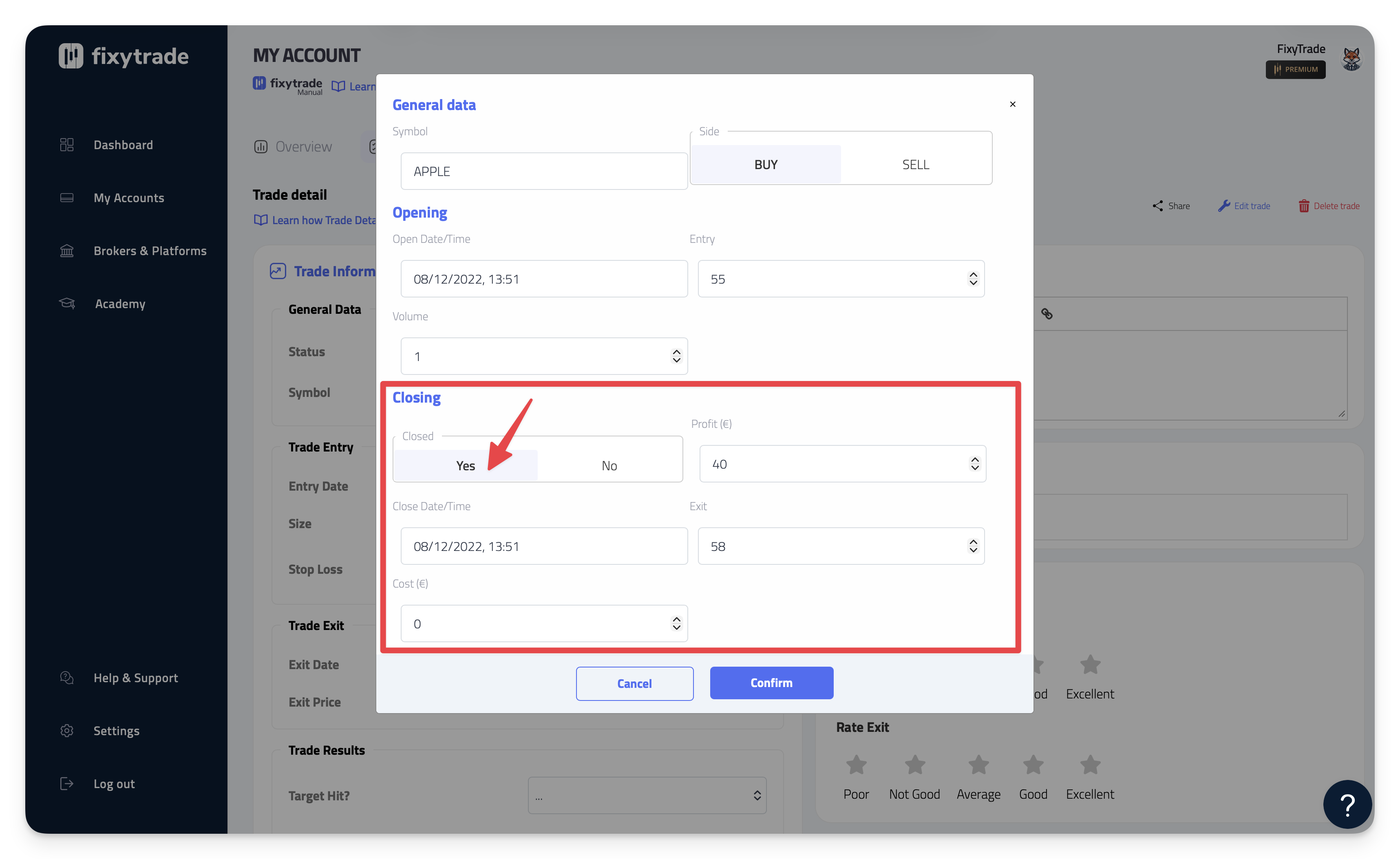 Under "Closing", click on "Yes" in the "Closed" section. You will then only need to enter your exit price, your profit, and any potential fees for the trade.