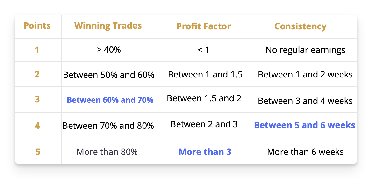 So now, challenge you to improve this score by focusing on the 3 criteria, which are the % of winning trades, the profit factor, and the consistency of your earnings.