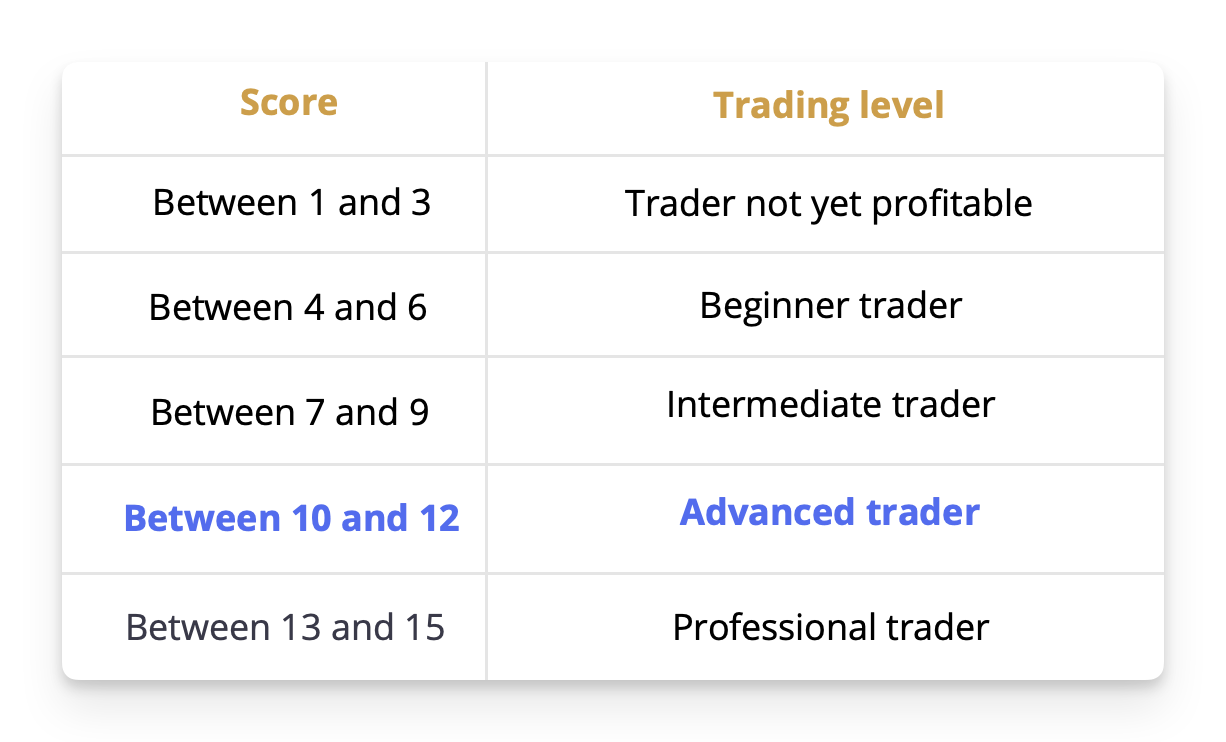 So as we got 12 points in our example, we are an advanced trader.