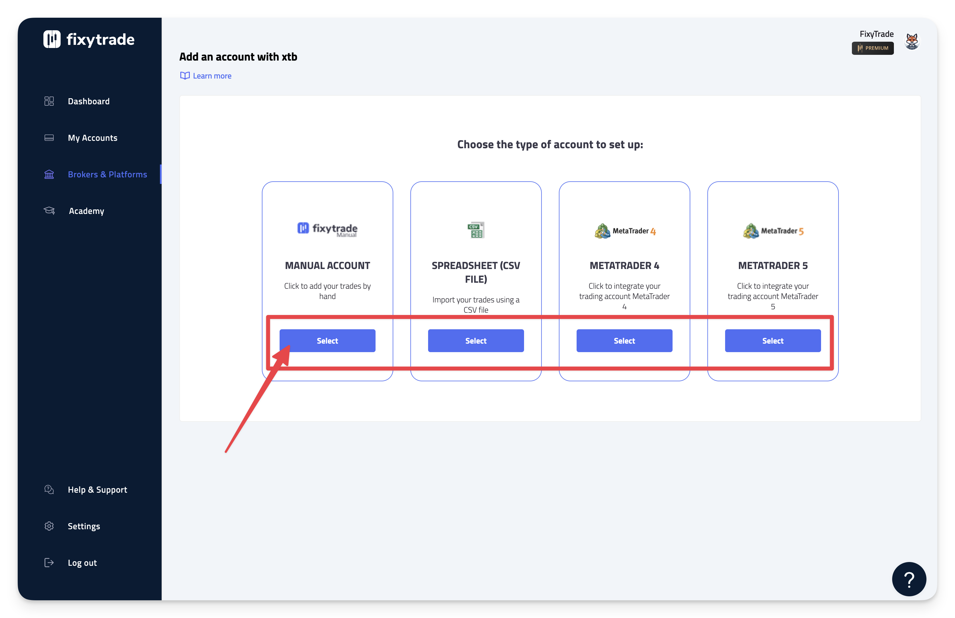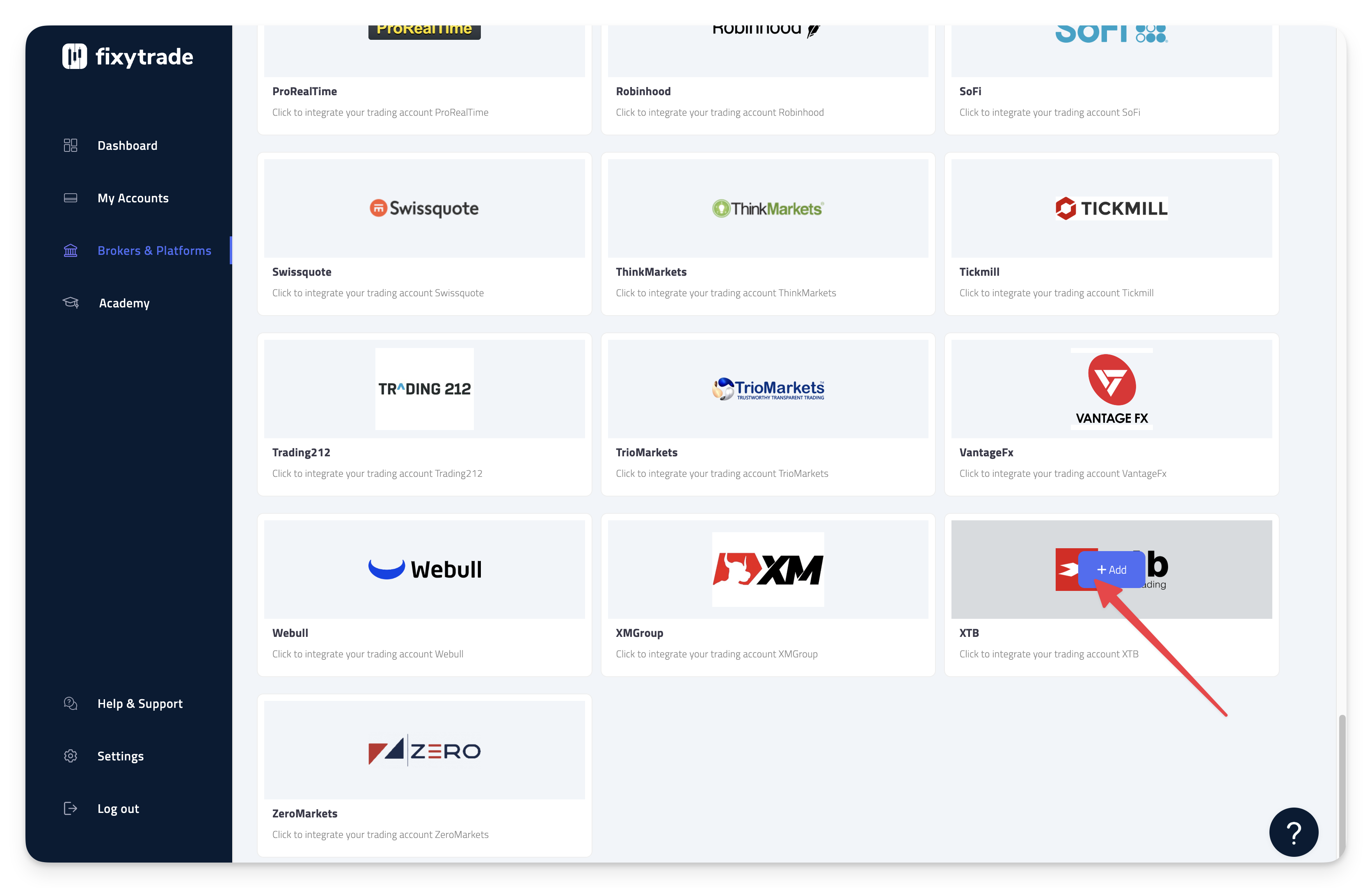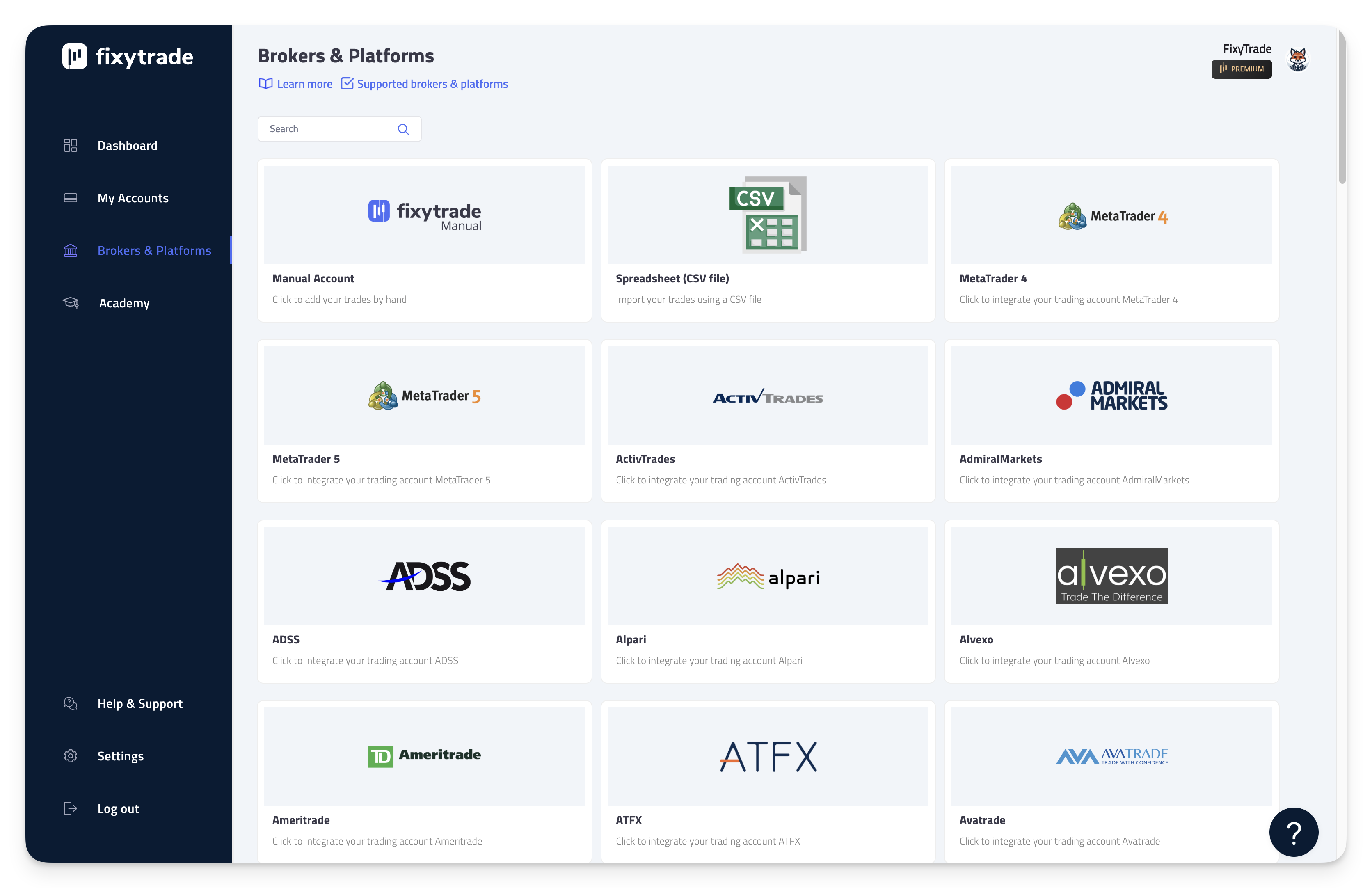 To add your first trading account, go to your FixyTrade dashboard and click on Add Account. You will be redirected to the Brokers & Platforms page.