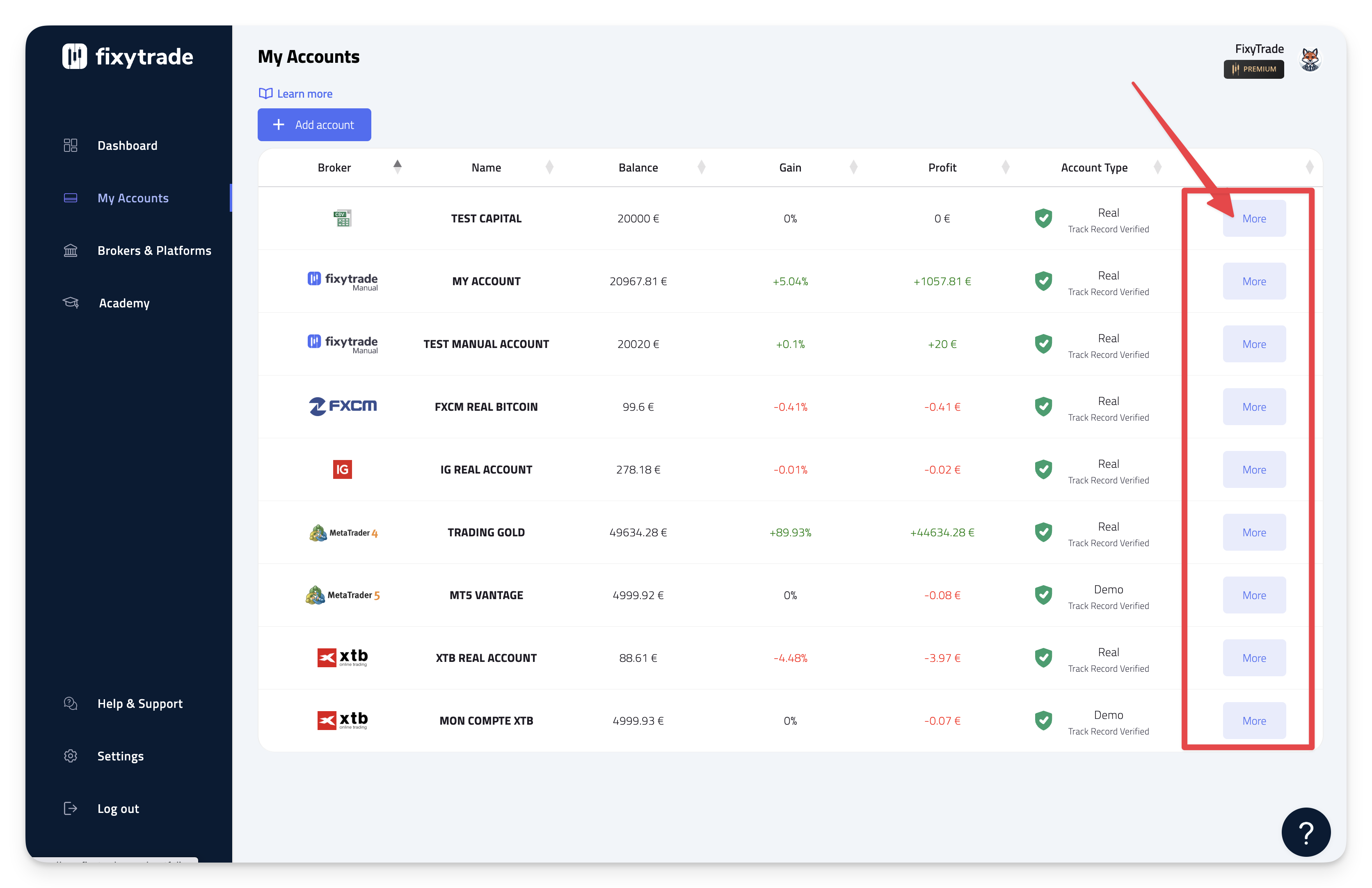 Step 2: Click on the "More" button corresponding to the trading account whose name you want to change.