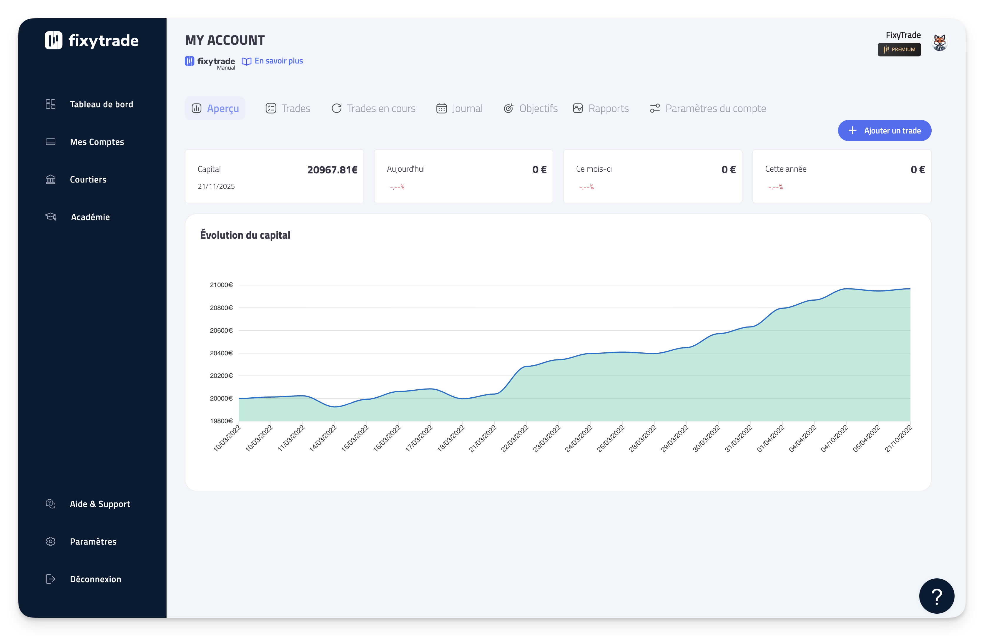 FixyTrade vous propose une importation et une synchronisation automatique ou manuelle en fonction de votre courtier. Cliquez sur le bouton ci-dessous pour découvrir les fonctionnalités compatibles avec votre courtier :