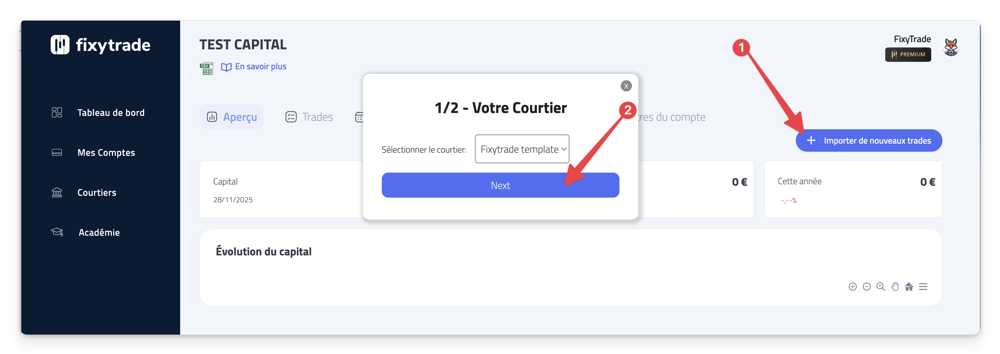 Une fois que vous avez ajouté vos trades et sauvegardé votre fichier, il est temps de l'importer dans FixyTrade.