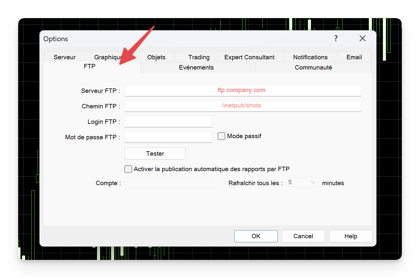 Veuillez utiliser les informations d'identification ci-dessous pour configurer vos options FTP MetaTrader 5 :