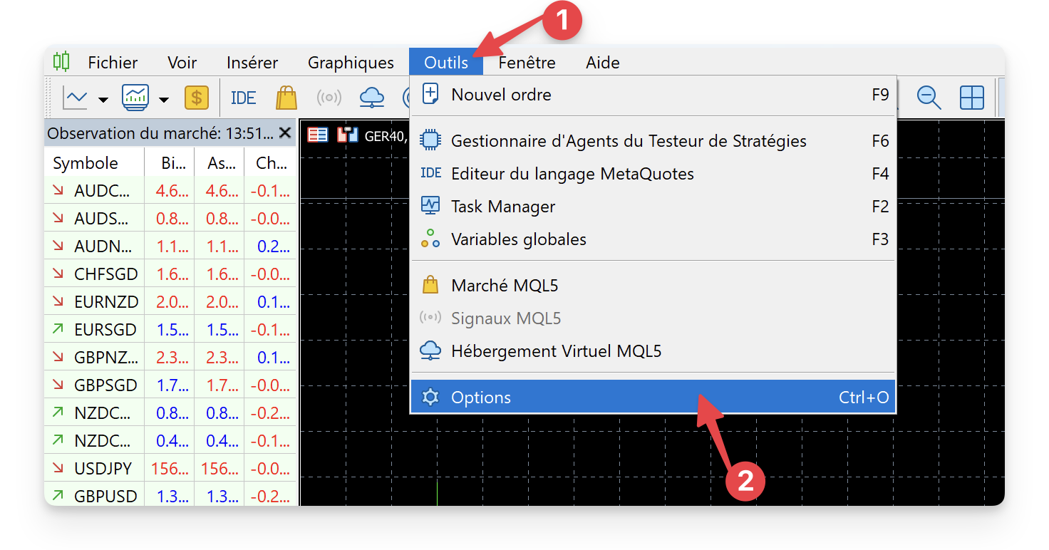 Étape 3 : En haut à gauche de votre tableau de bord, cliquez sur Outils puis sur Options.