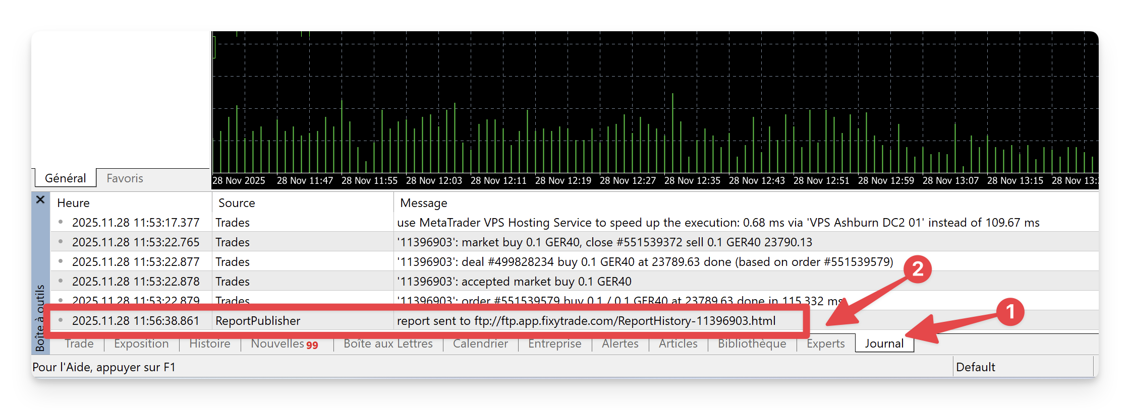 Pour synchroniser vos données de trading, MetaTrader 5 doit être ouvert sur votre ordinateur. FixyTrade ne sera pas en mesure de synchroniser vos données si MetaTrader 5 n'est pas ouvert sur votre ordinateur. Vous pouvez vérifier la synchronisation à tout moment en cliquant sur l'onglet Journal dans MetaTrader 5 puis en attendant "report sent to...".
