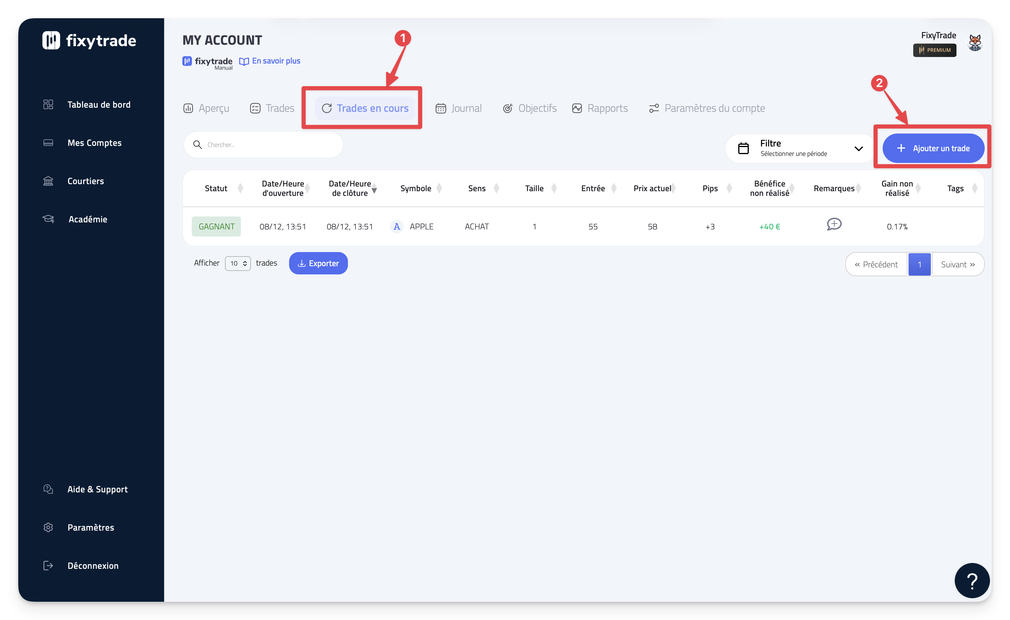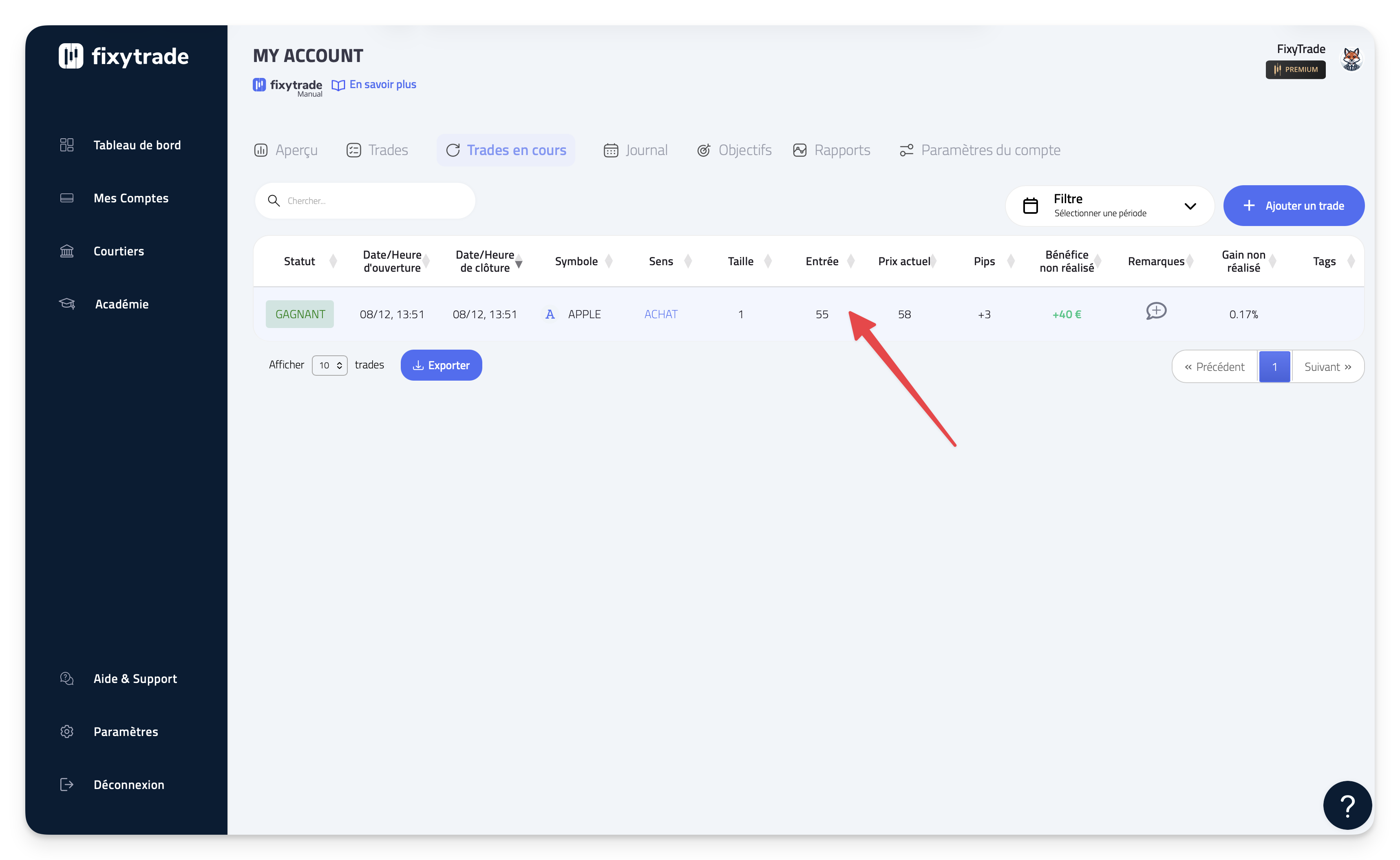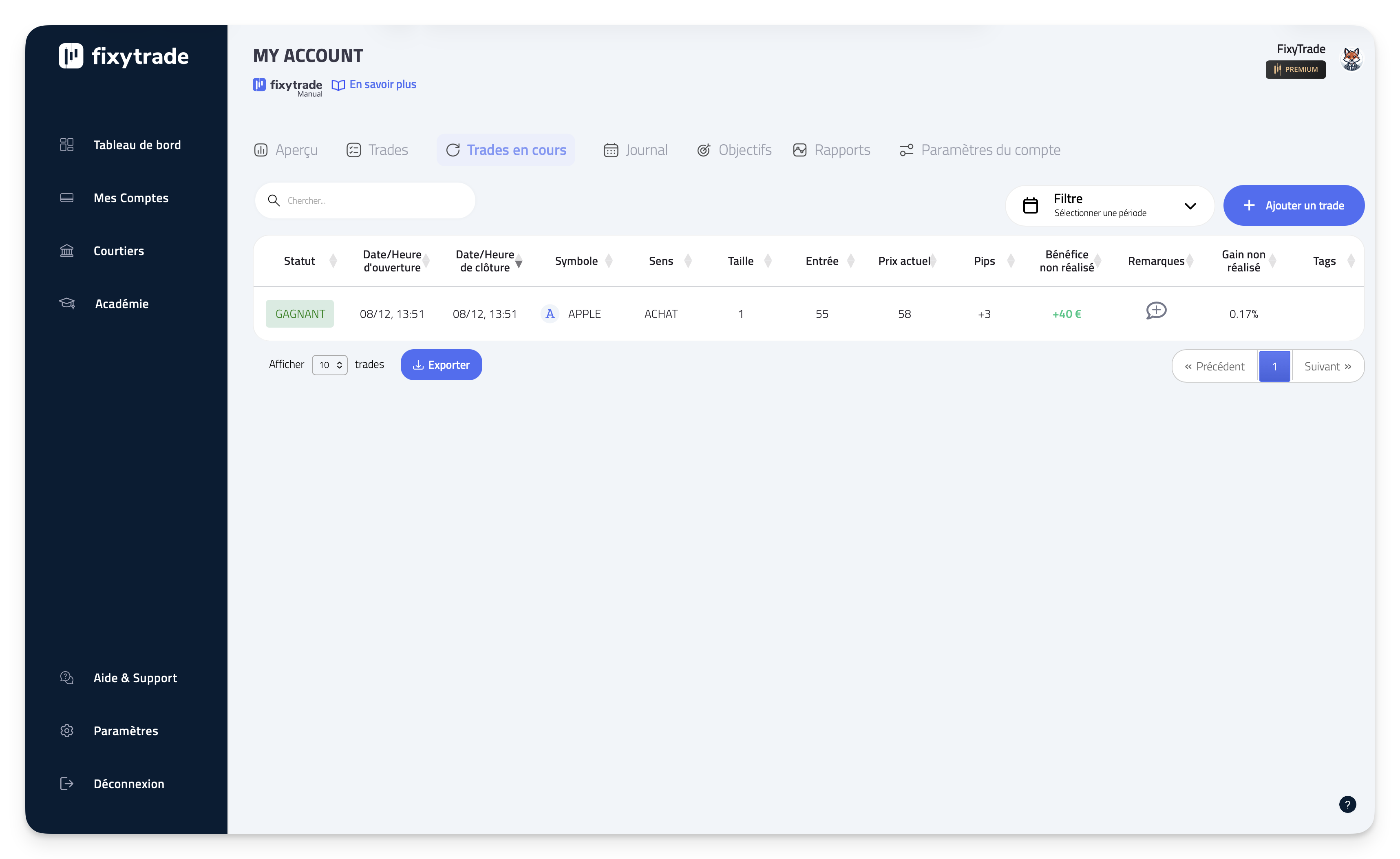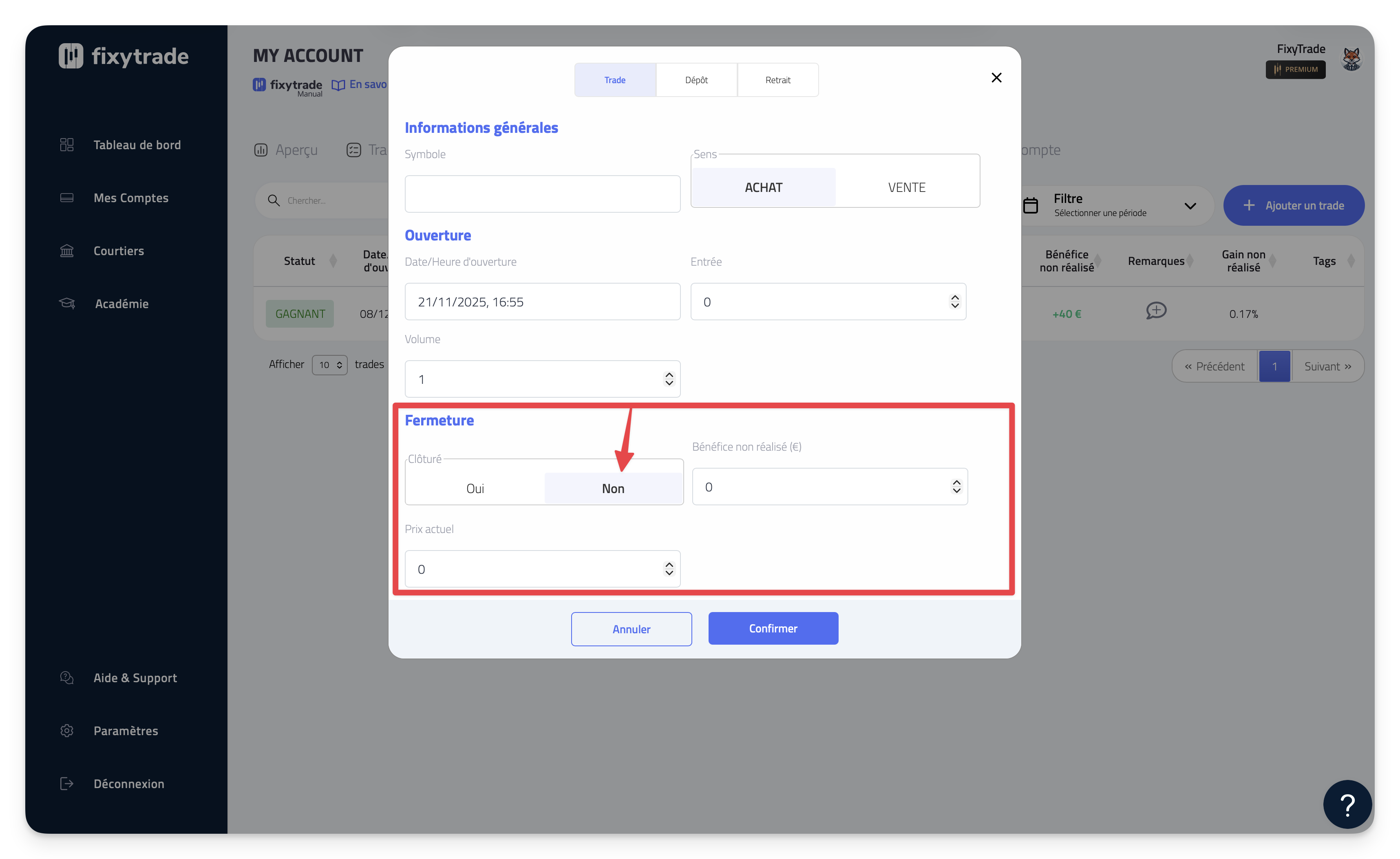 Au moment où votre trade sera clôturé sur votre plateforme de trading, il faudra donc le transformer en clôturé dans FixyTrade. Pour cela, suivez les étapes ci-dessous :