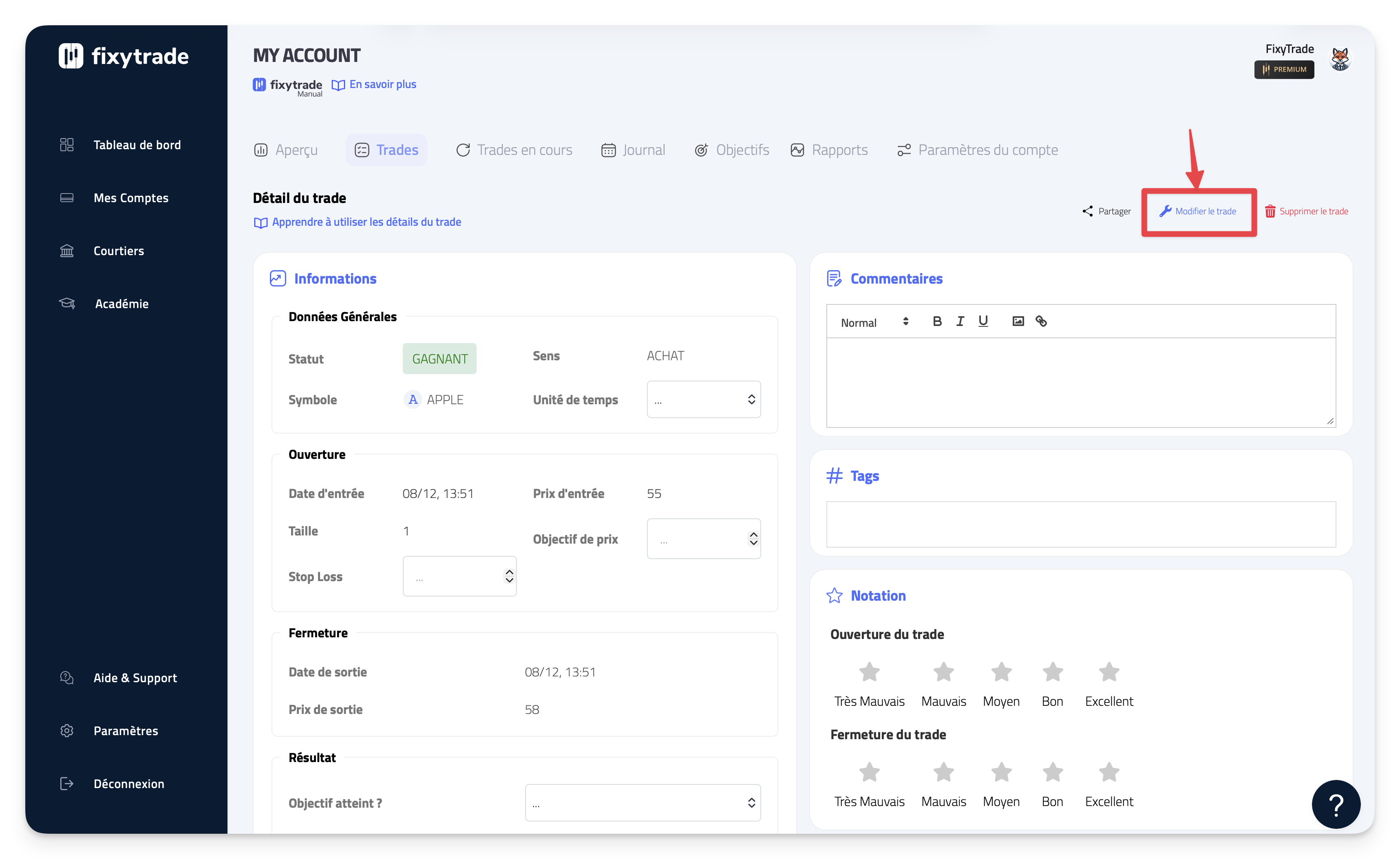 Vous arriverez sur le détail du trade. Cliquez sur "Modifier le trade" pour afficher la popup de modification du trade.