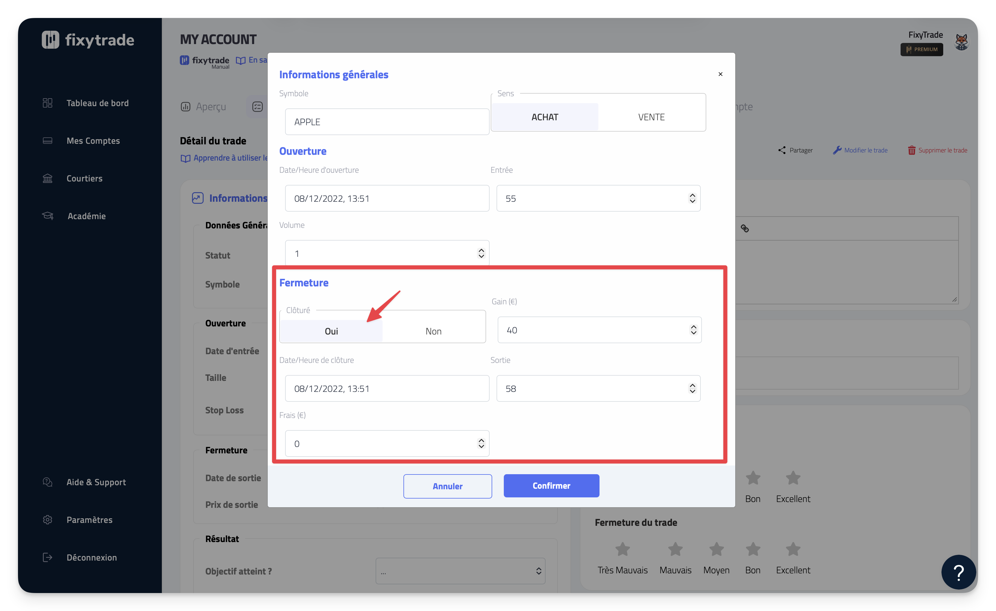 Sous "Fermeture", cliquez sur "Oui" dans la partie "Clôturé". Il vous suffira ensuite d'indiquer votre prix de sortie, votre gain ainsi que les frais potentiels du trade.